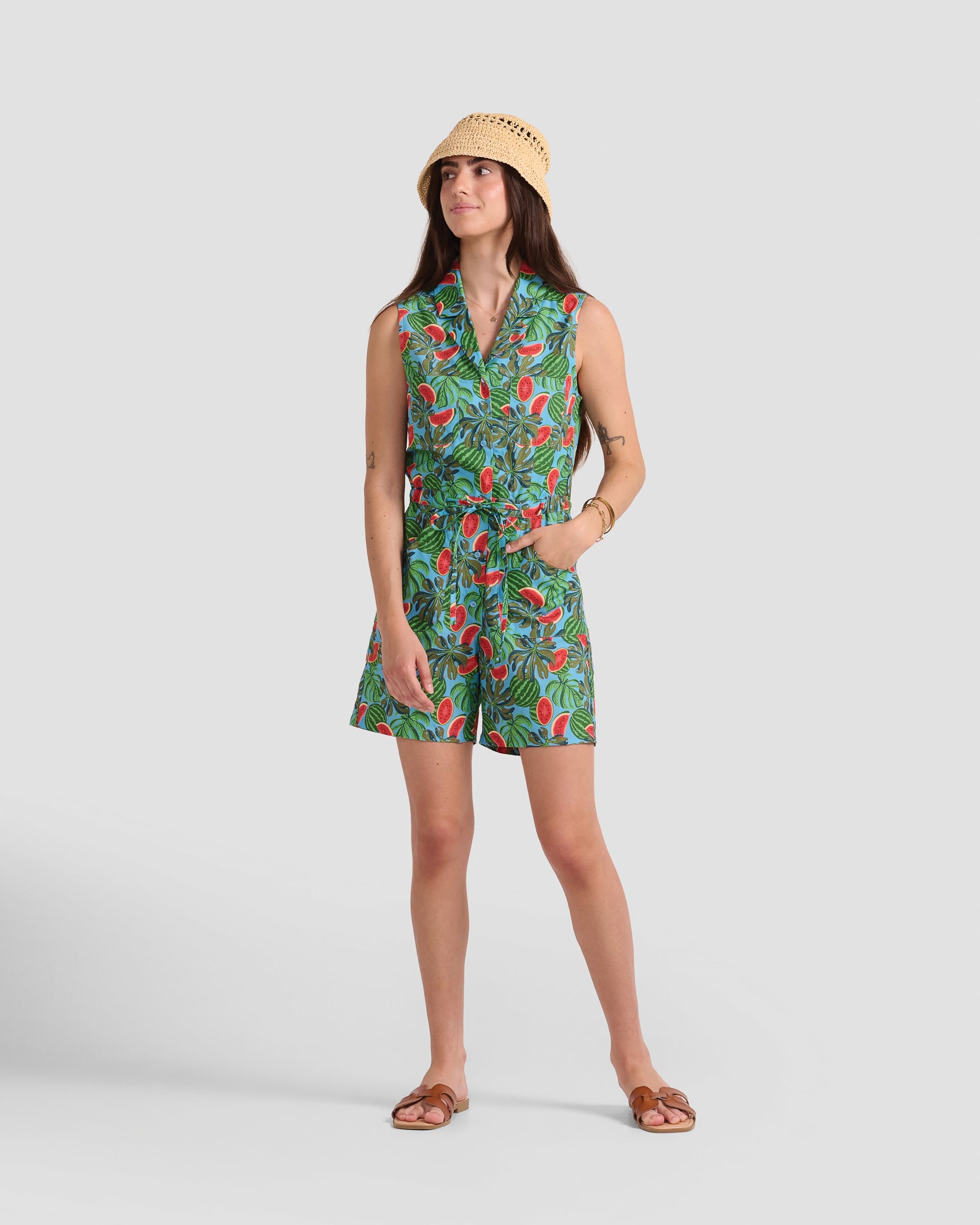 Discover our Women's Watermelon Print romper, crafted from 100% Cotton Poplin.
